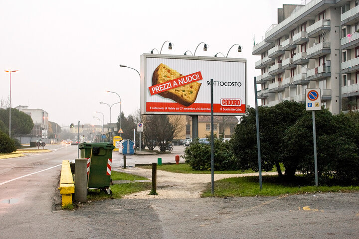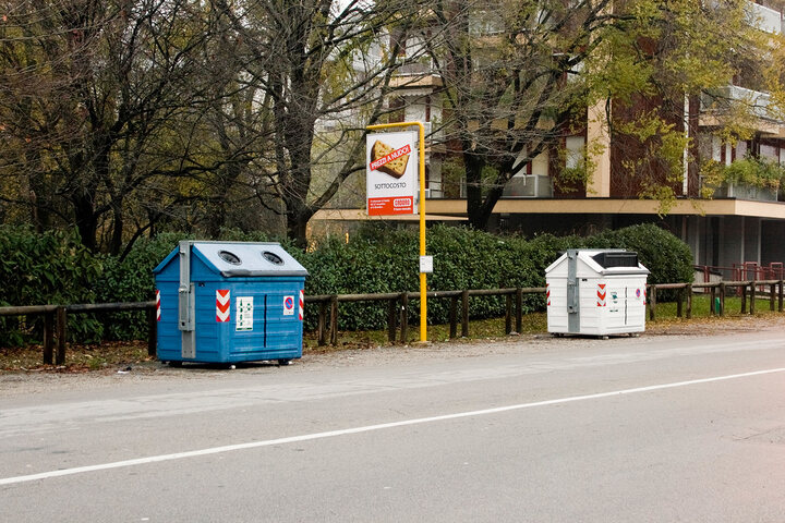 The ads, placed near a dust bin, promote discounts on food and goods at a supermarket.